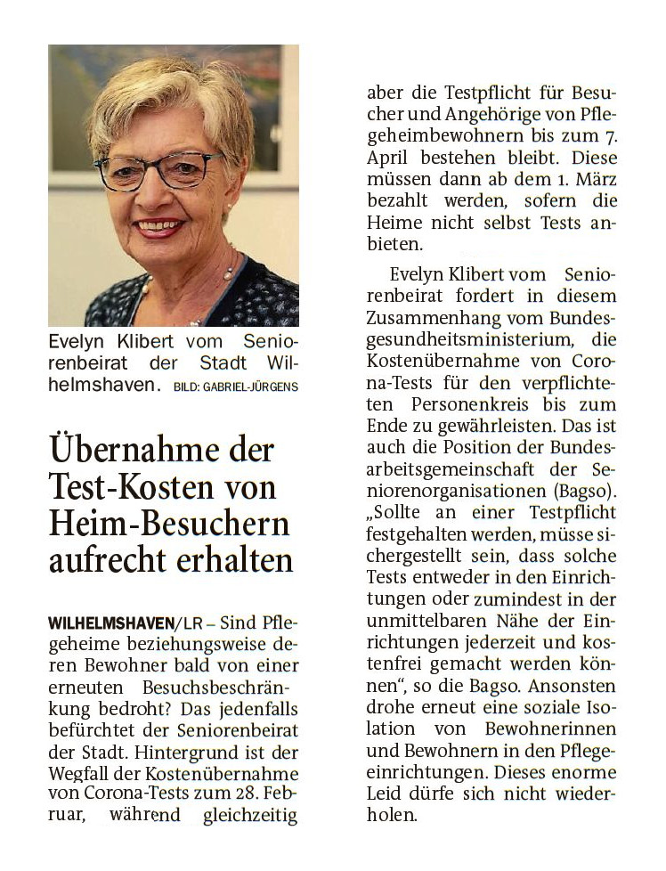 (Die Seite wurde neu angelegt: „{{PageHeader}} == Bericht der Wilhelmshavener Zeitung vom 02.02.2023 == Datei:WZ - 02.02.2023.Uebernahme der Test-Kosten-c.jpg {{PageFooterWZ}}“) |