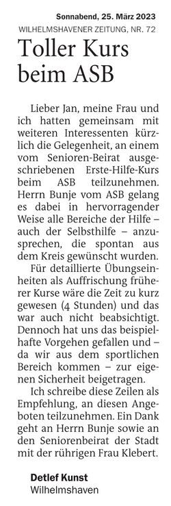 Leserbrief in der Wilhelmshavener Zeitung vom 25.03.2023